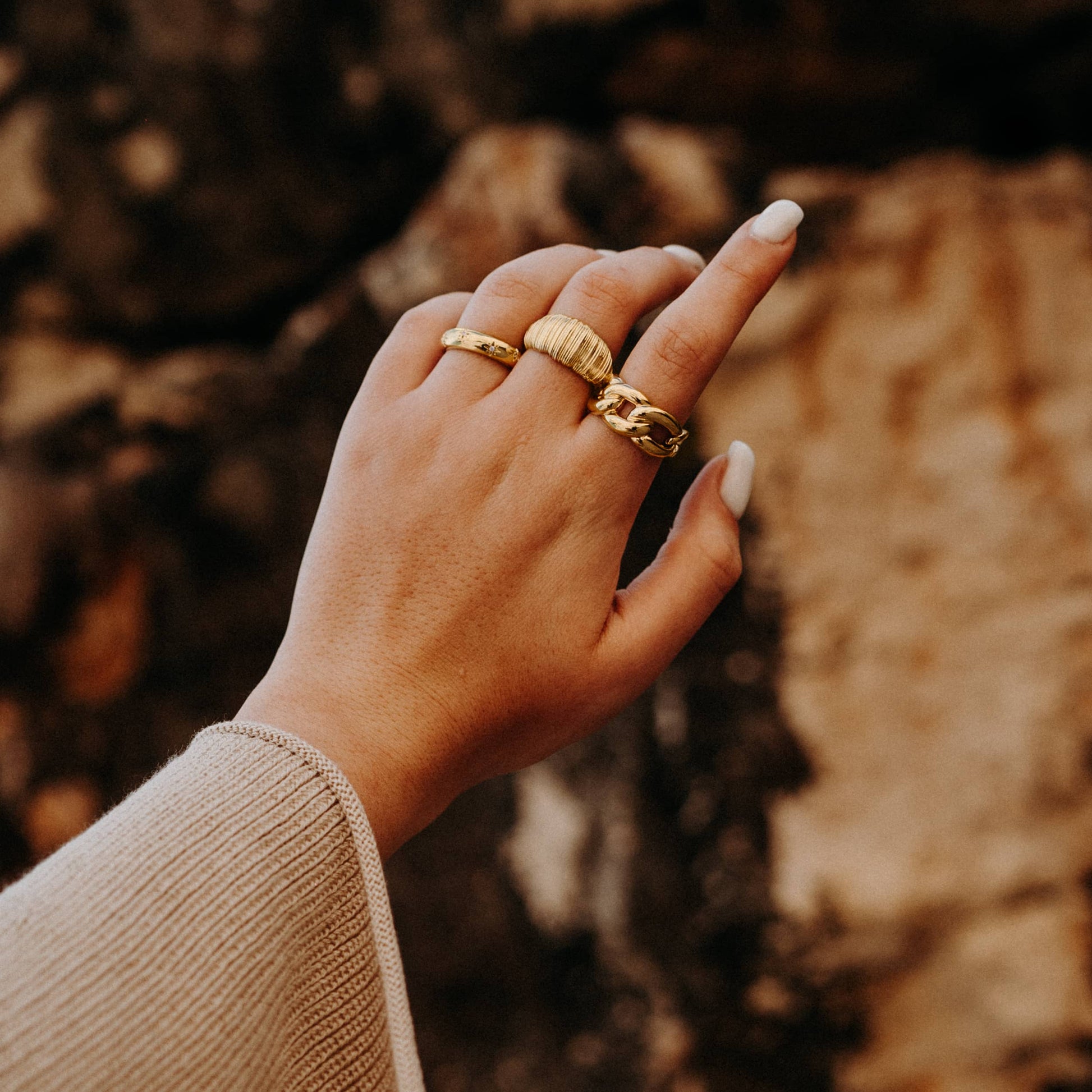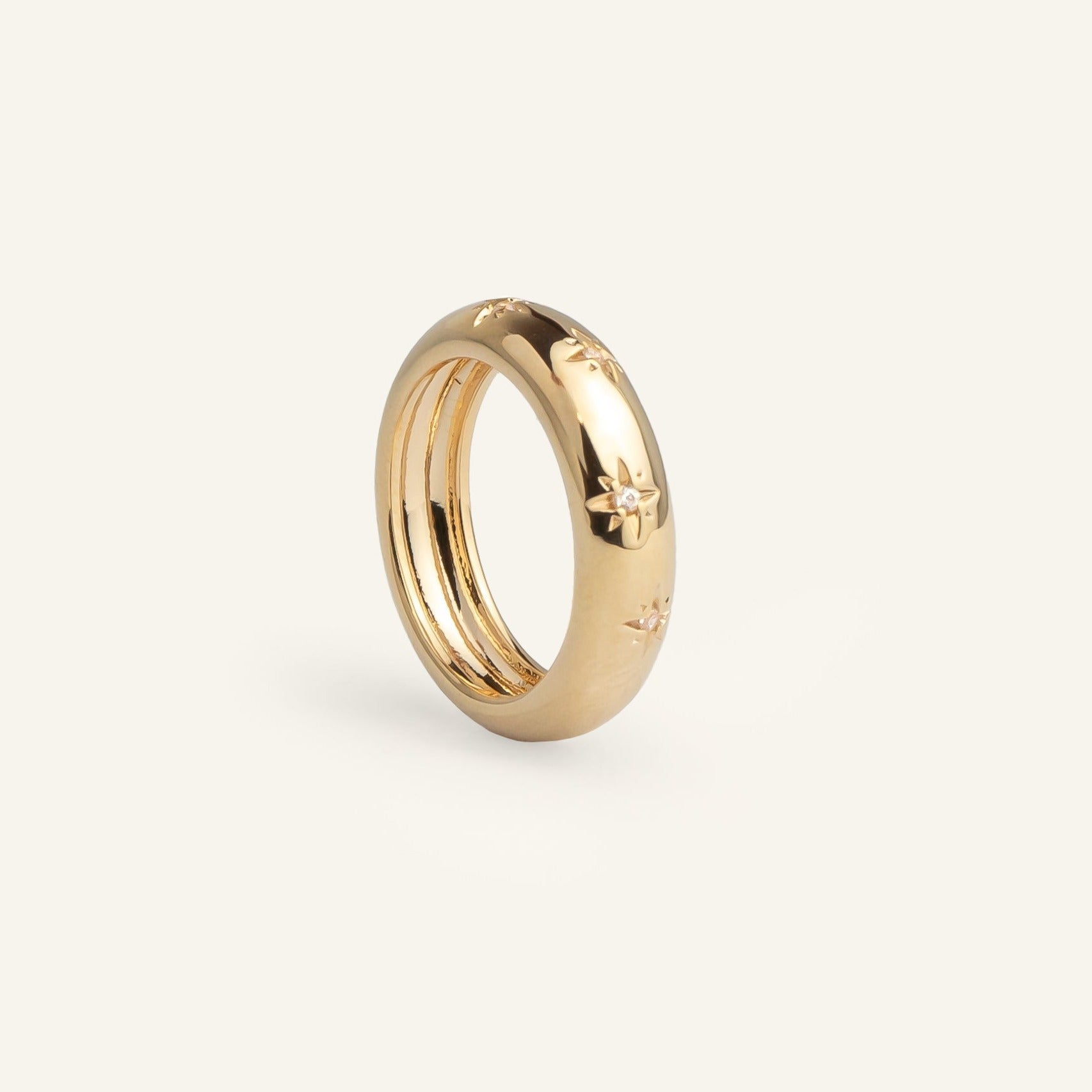 Un anillo grueso de oro chapado, adornado con delicados detalles, engastados con circonios.