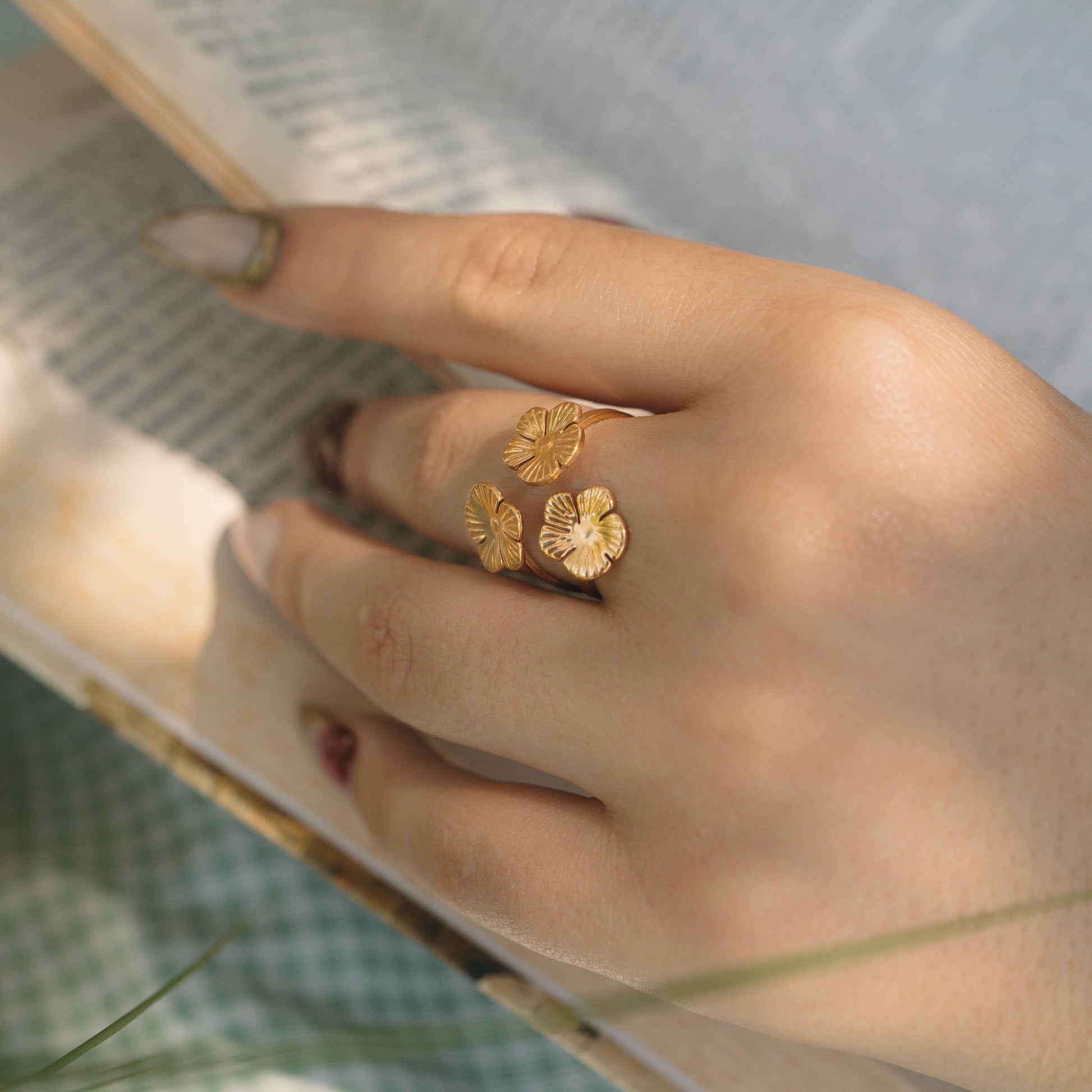 Anillo dorado triple flores – ¡un toque de poesía para iluminar tus manos!