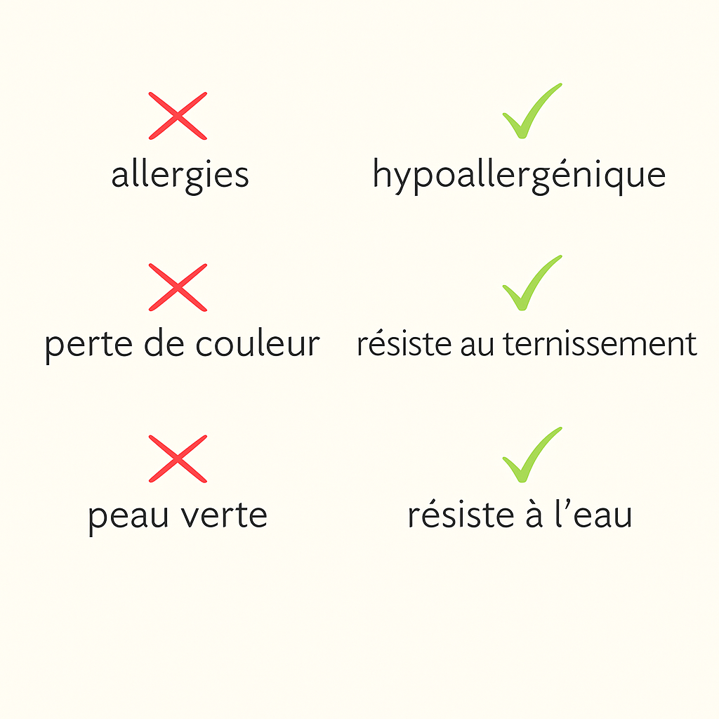 Fabricado en acero inoxidable impermeable, nunca más tendrás que preocuparte por la decoloración o el deslustre de tus joyas.